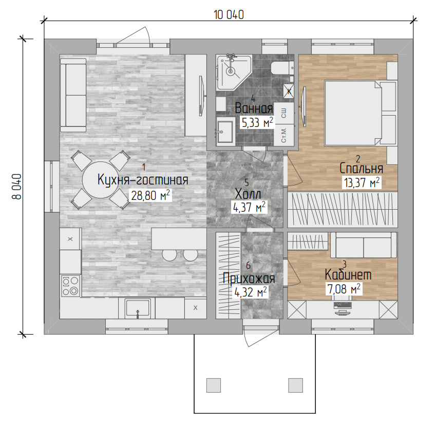 Одноэтажный дом с кухней-гостиной 28 м2, спальней 13 м2 и кабинетом 7 м2