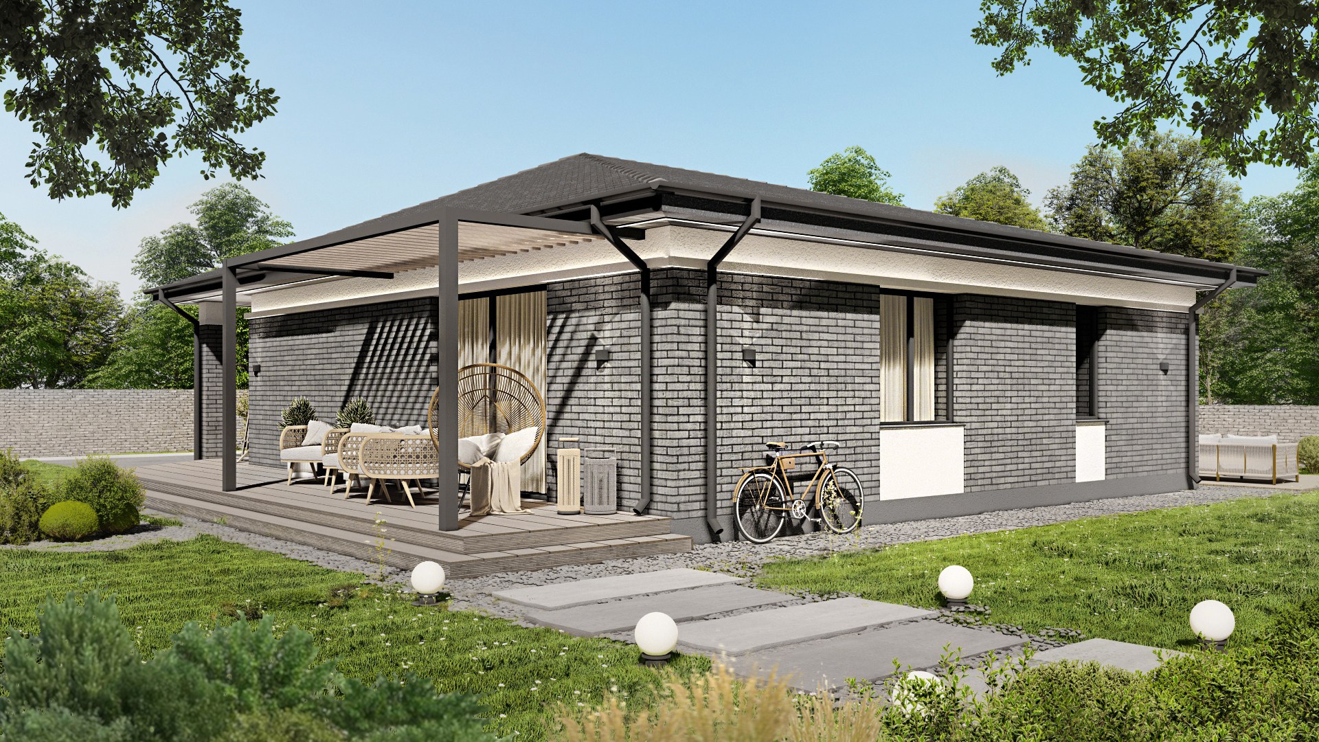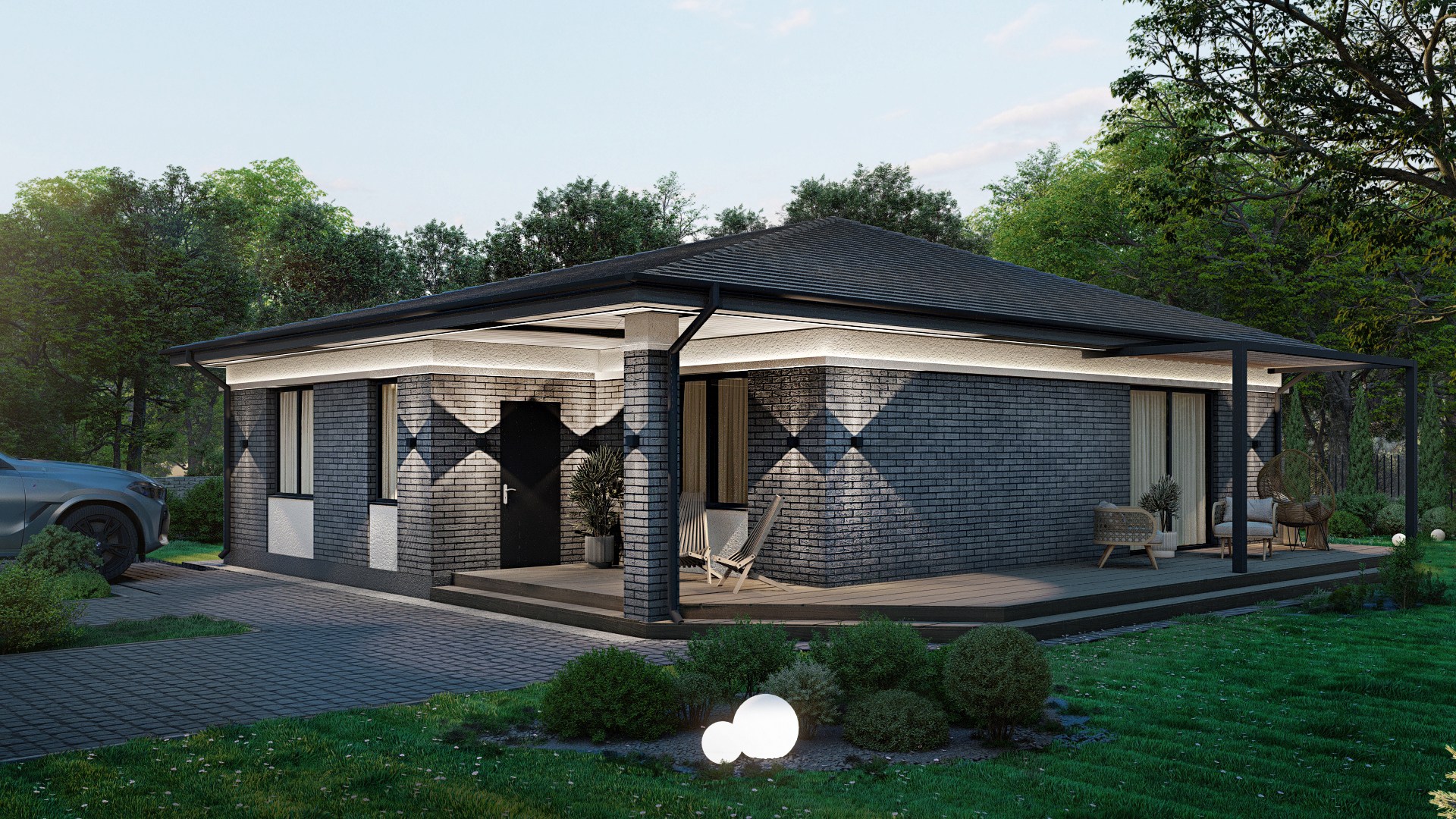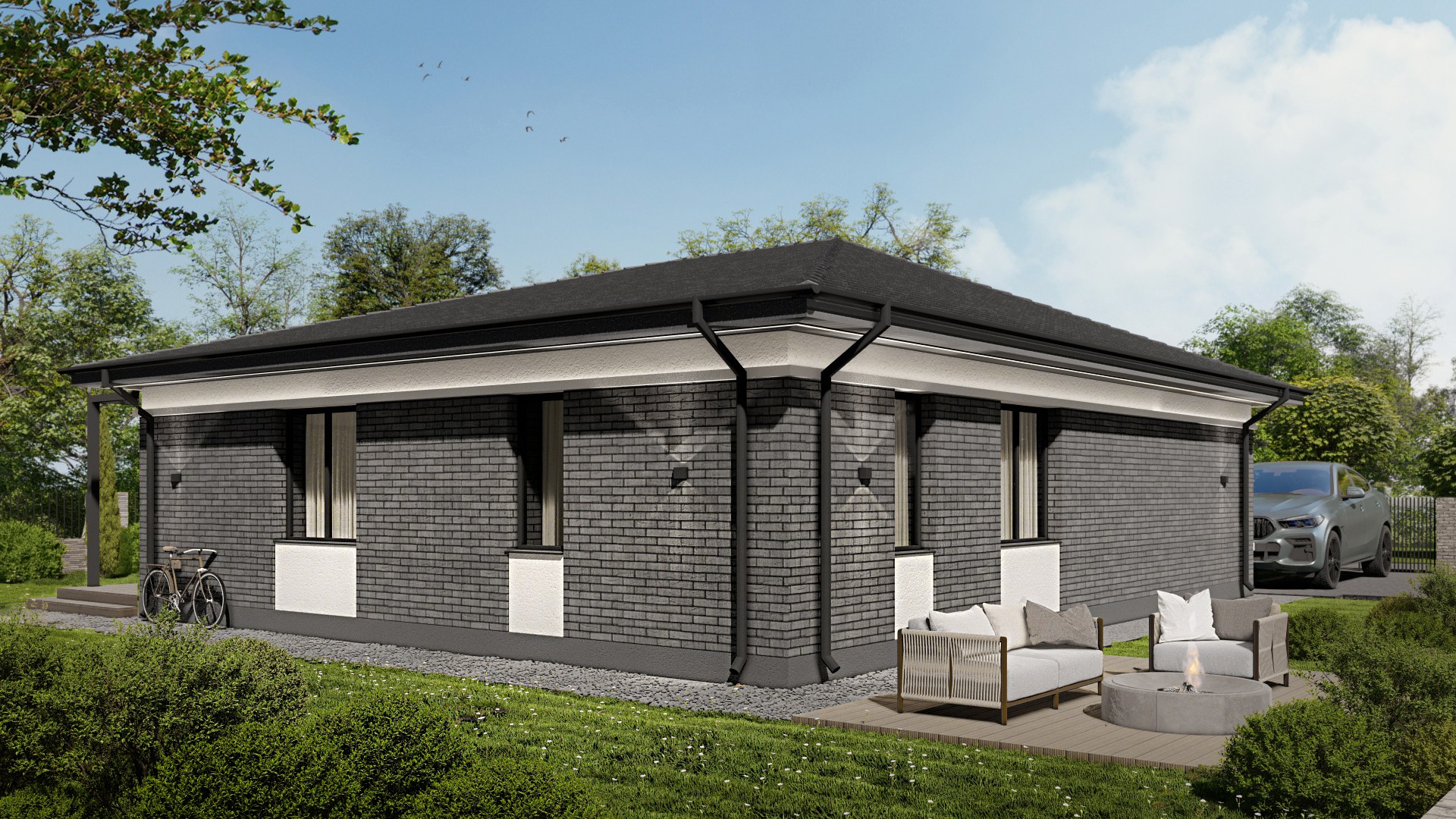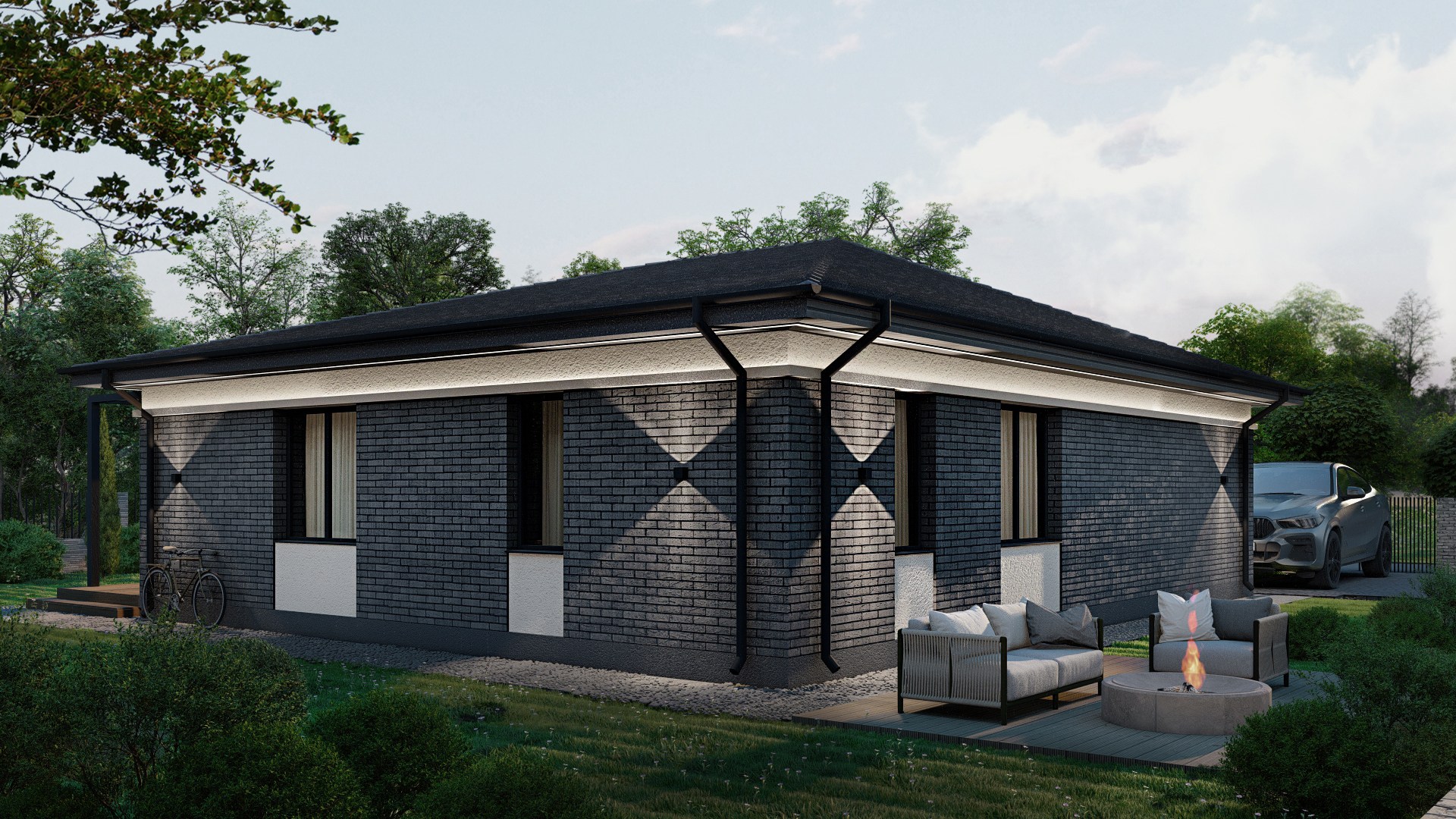 Этот дом площадью 99 м² спроектирован как современное и удобное пространство для постоянного проживания. Центральным элементом планировки является большая кухня-гостиная площадью более 30 м² с выходом на террасу, где можно проводить время с семьёй и принимать гостей. В доме предусмотрены три отдельные спальни, два санузла, гардероб и техническое помещение котельной. Одноэтажная архитектура делает дом особенно комфортным для жизни — все помещения расположены на одном уровне. Кирпичный фасад и четырёхскатная кровля создают современный и долговечный внешний вид дома.