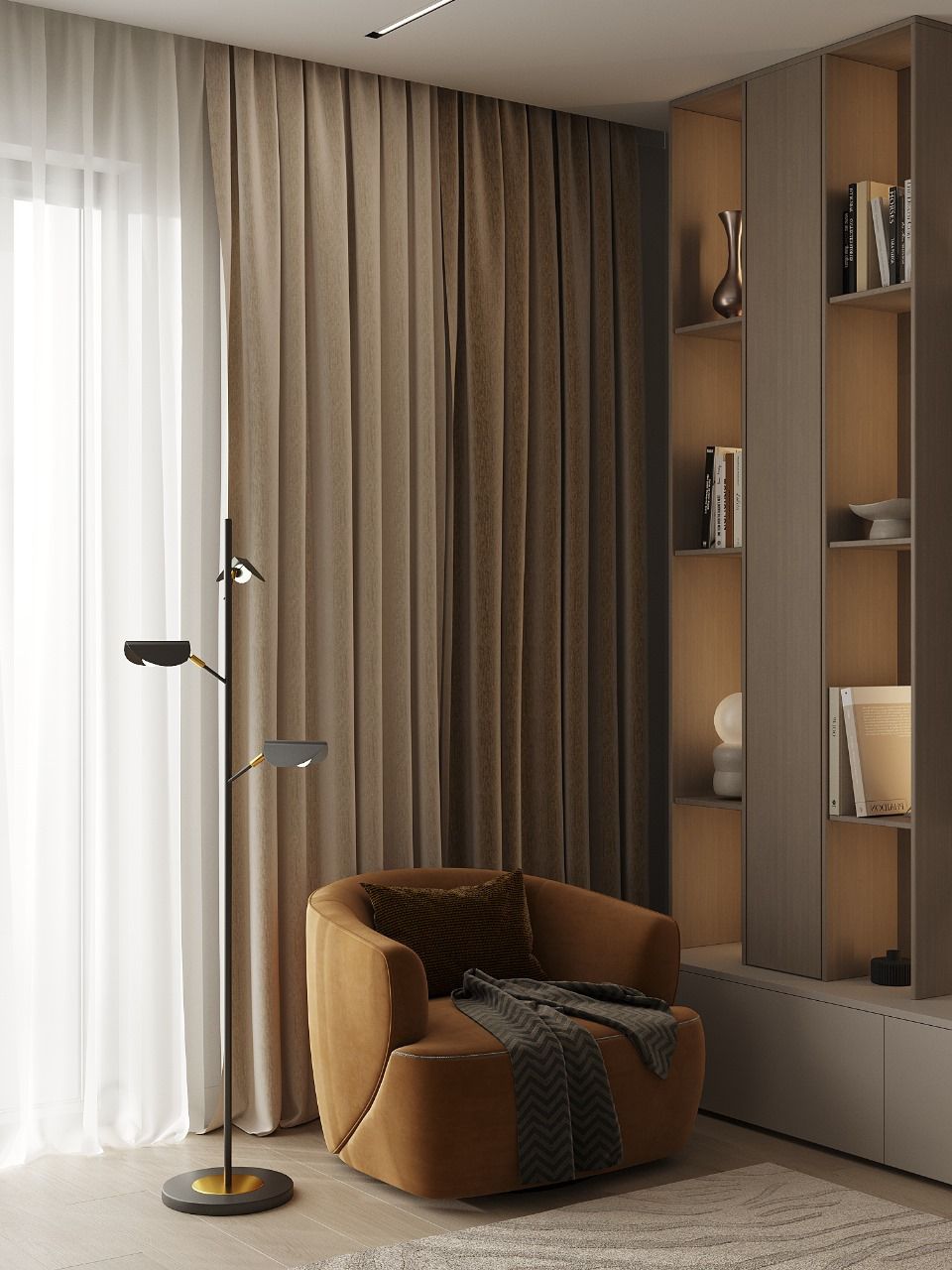 На визуализации показана уютная зона отдыха рядом с гостиной. Здесь расположено мягкое кресло и встроенный книжный шкаф.