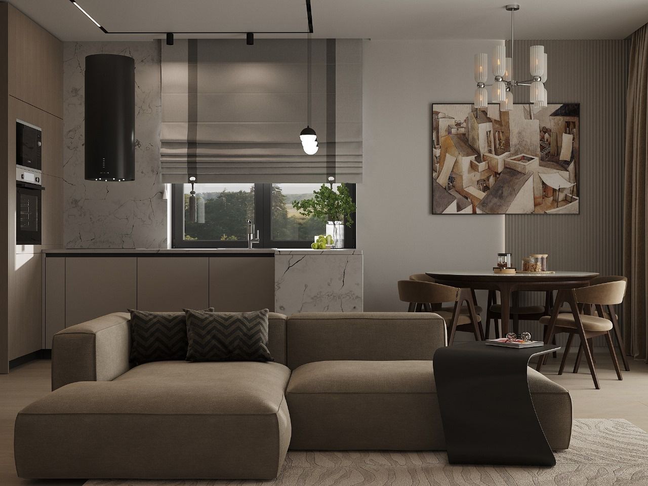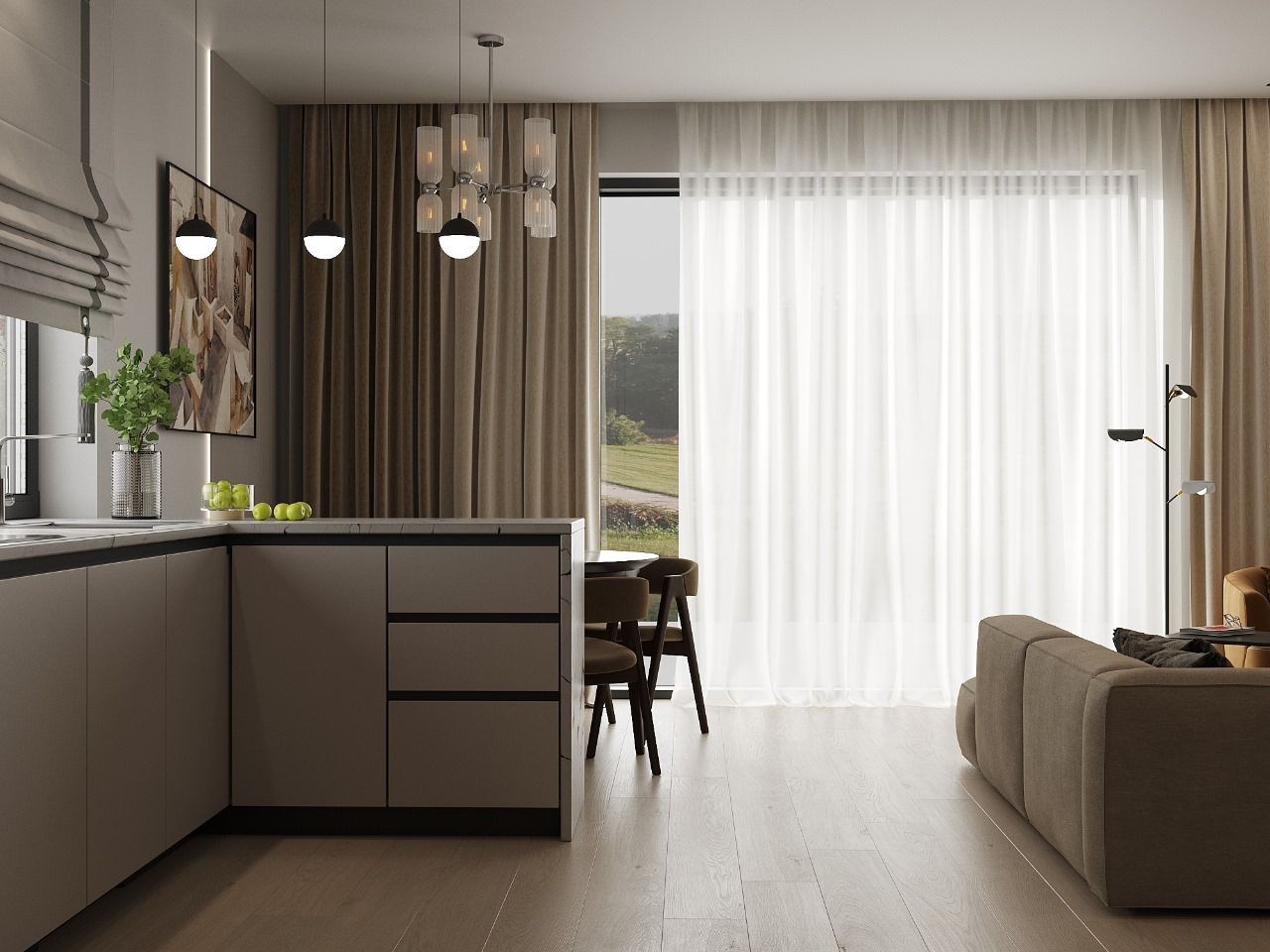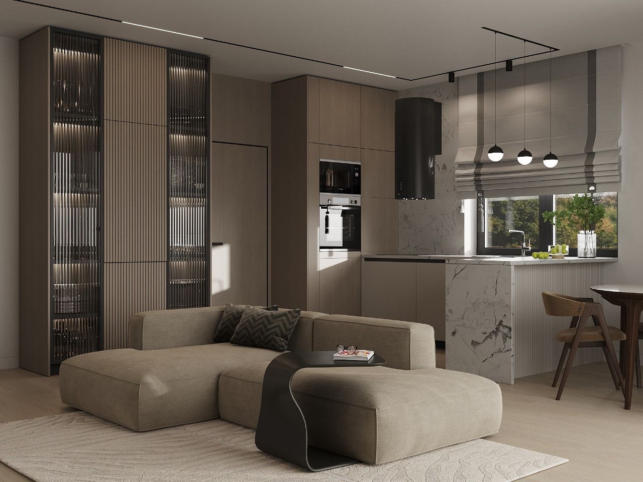 В интерьере используется современный минималистичный стиль с тёплыми природными оттенками. Мягкий диван формирует уютную зону отдыха перед телевизором, а кухня выполнена в спокойных бежево-серых тонах с использованием каменной столешницы.