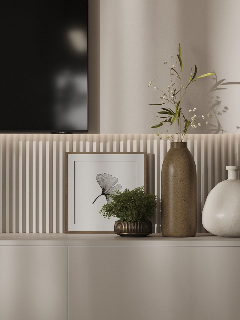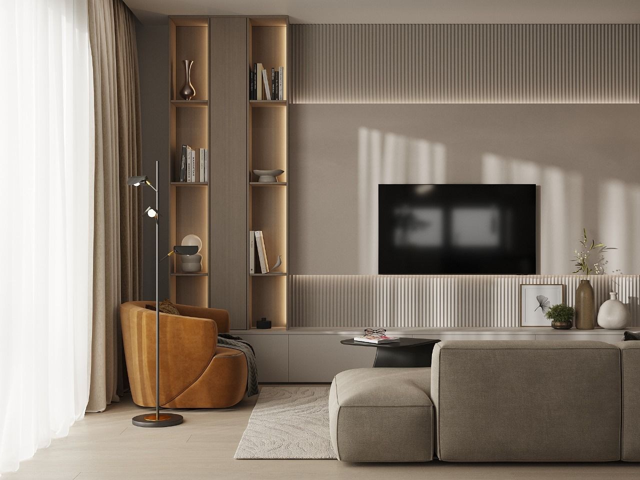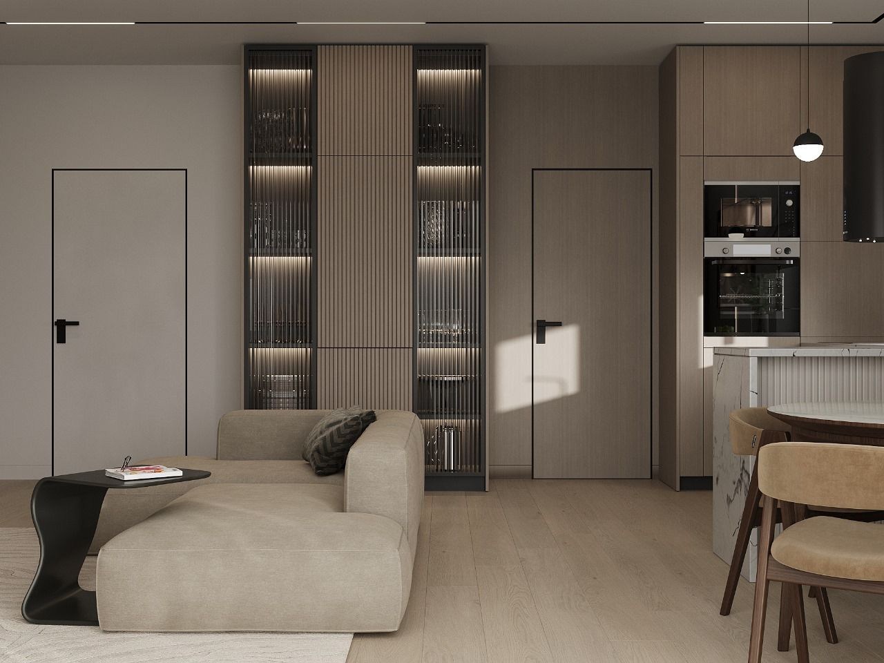 В интерьере используется современный минималистичный стиль с тёплыми природными оттенками. Мягкий диван формирует уютную зону отдыха перед телевизором, а кухня выполнена в спокойных бежево-серых тонах с использованием каменной столешницы.