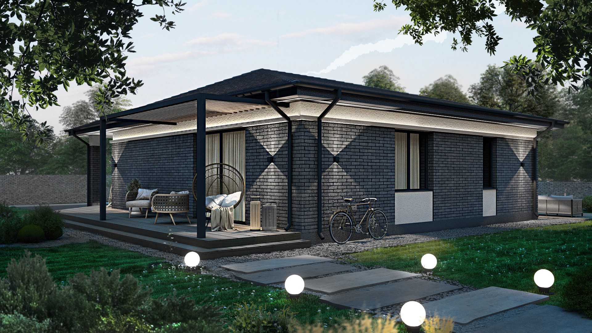 Большие свесы кровли защищают фасад от осадков и создают выразительную архитектурную линию по периметру здания. По фасаду предусмотрена декоративная архитектурная подсветка, которая подчёркивает фактуру кирпича и придаёт дому современный вид в вечернее время.