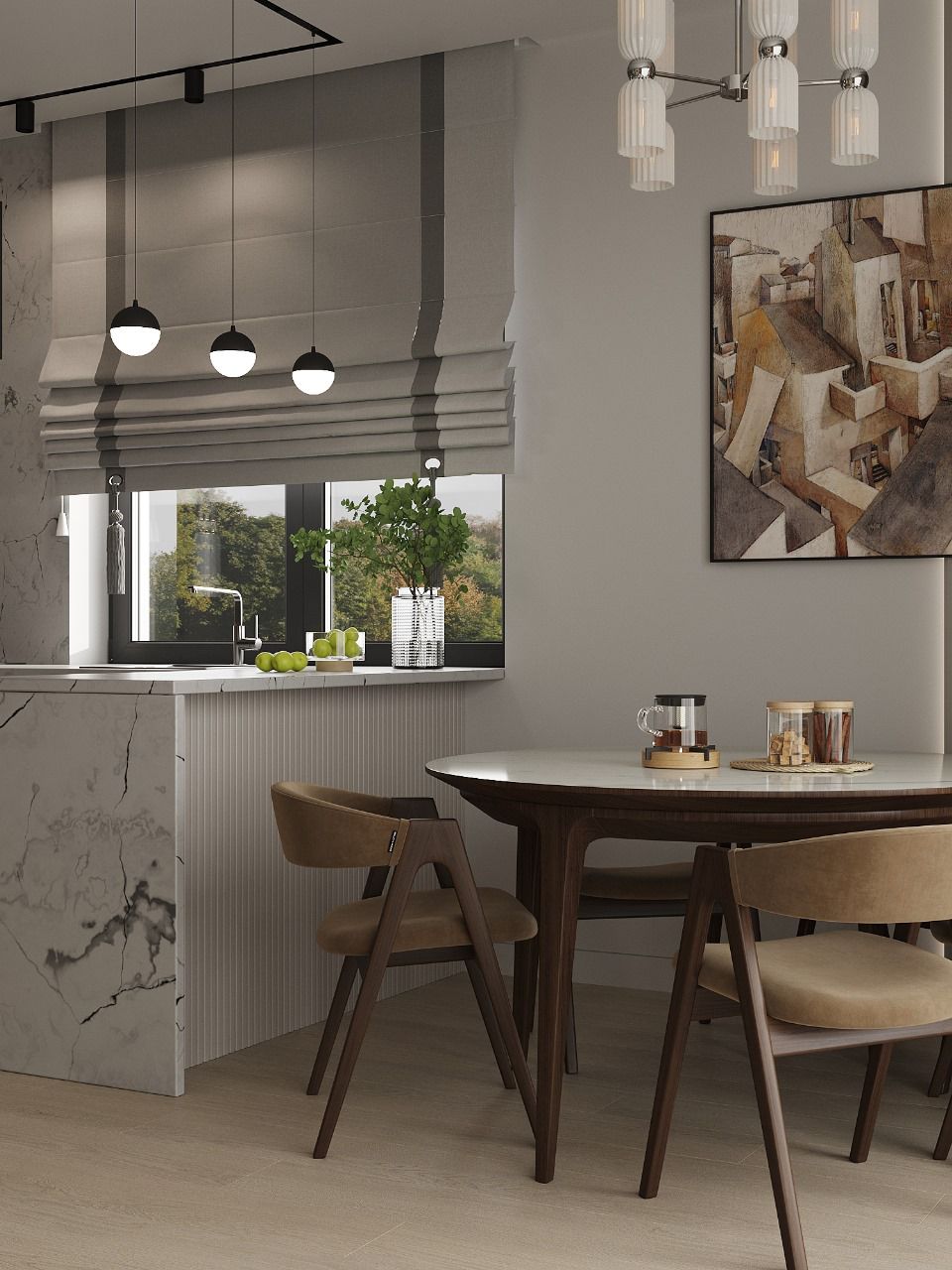 На изображении показана обеденная зона рядом с кухней. Круглый стол создаёт уютную атмосферу и удобен для общения.