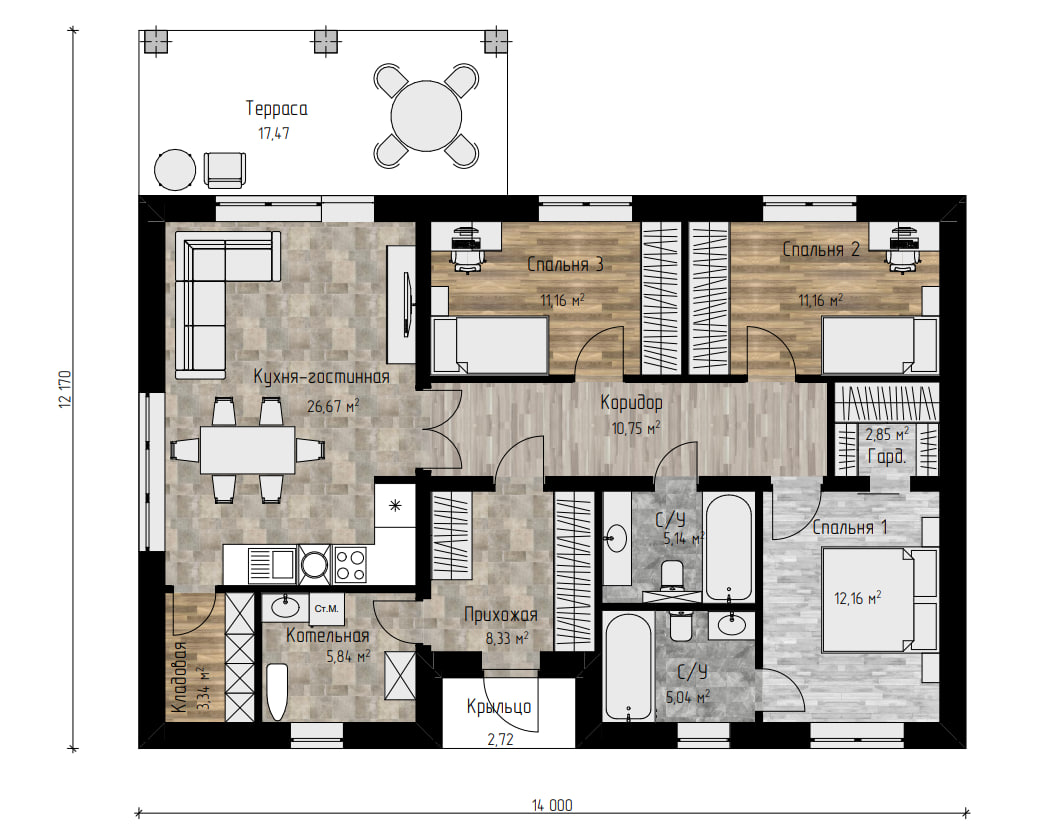 Функциональный одноэтажный дом с просторной кухней-гостиной 26,67 м2, тремя изолированными спальнями (12,16 м2, 11,16 м2 и 11,16 м2), двумя санузлами по 5,14 м2 и 5,04 м2, гардеробной 2,85 м2, котельной 5,84 м2 и кладовой 3,34 м2. Планировка разделяет общую и приватную зоны, а большая терраса 17,47 м2 расширяет жилое пространство и подходит для отдыха и приёма гостей.